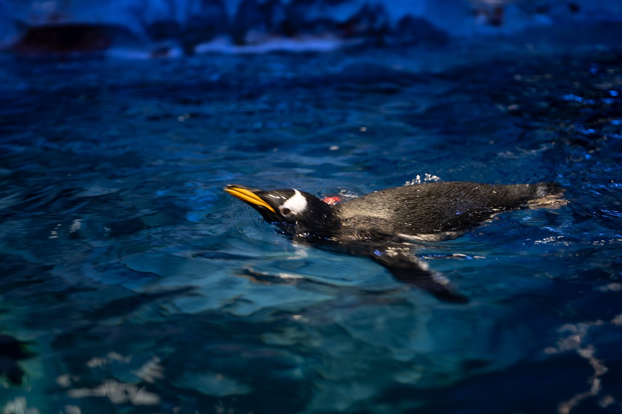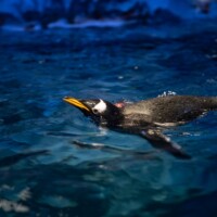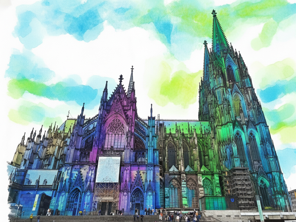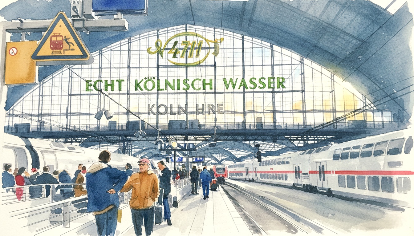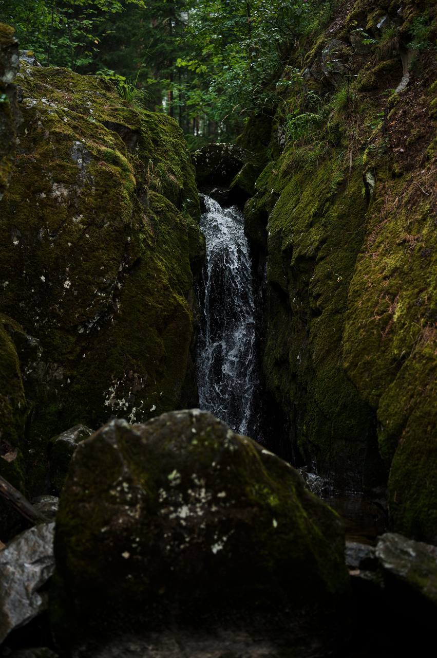 A tall, powerful waterfall cascades down a cliffside, framed by lush green vegetation, with a bridge crossing above.