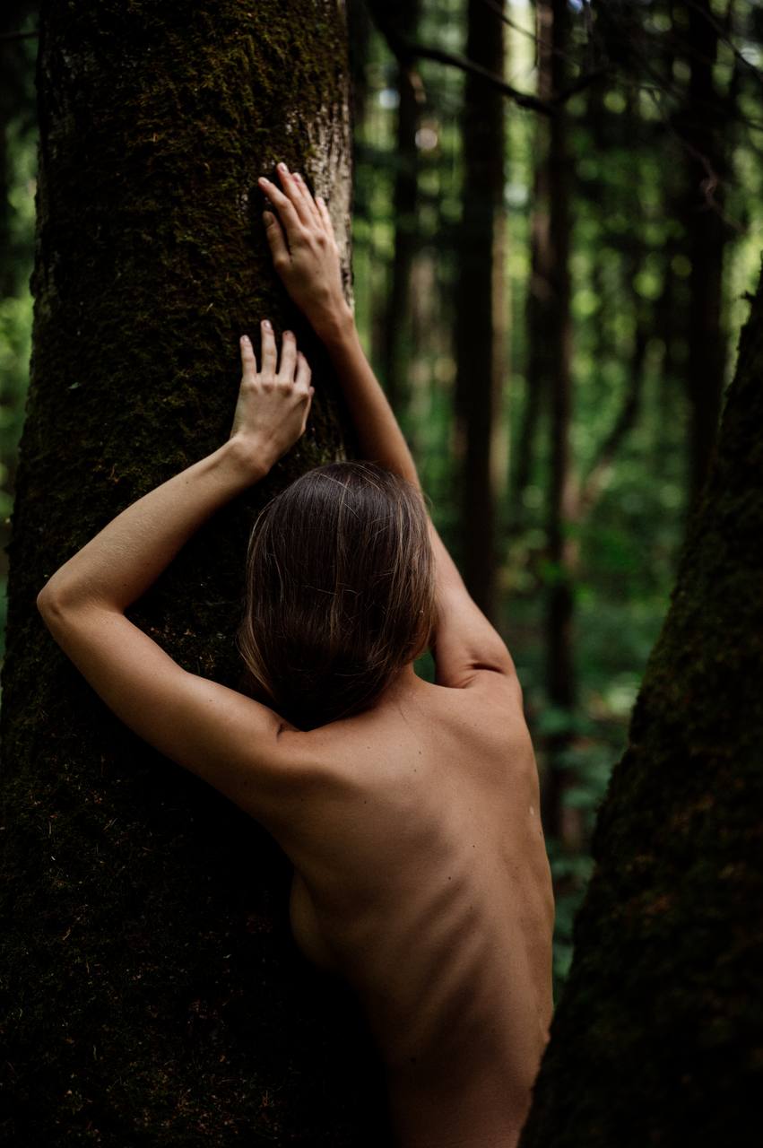 Mossy tree trunk in green forest