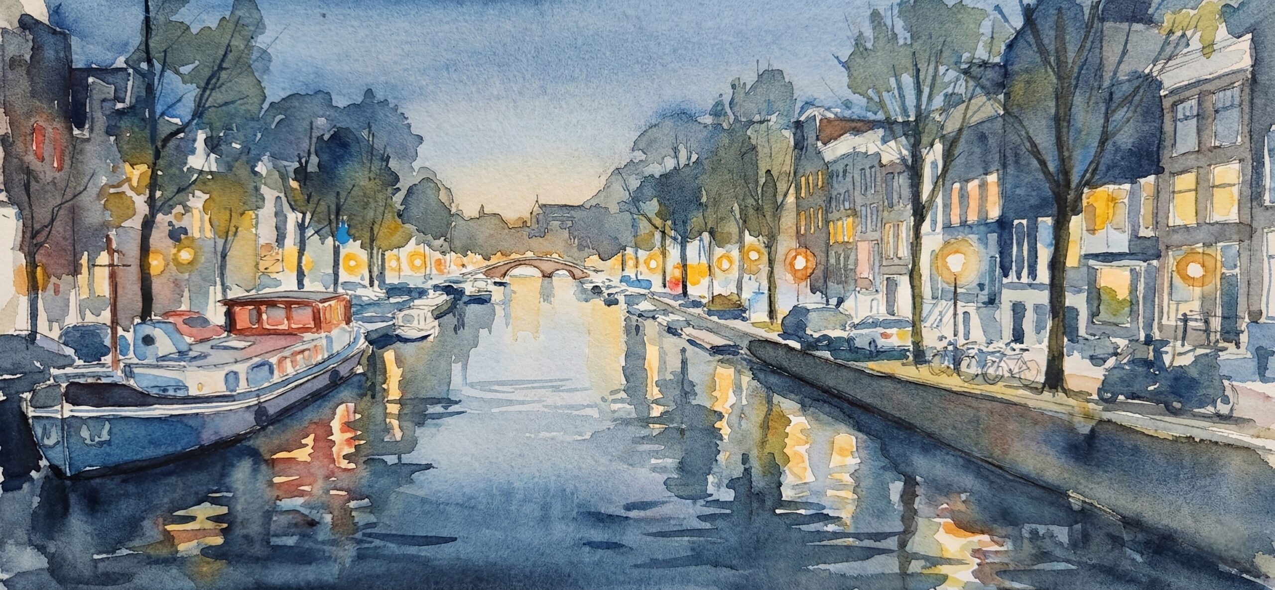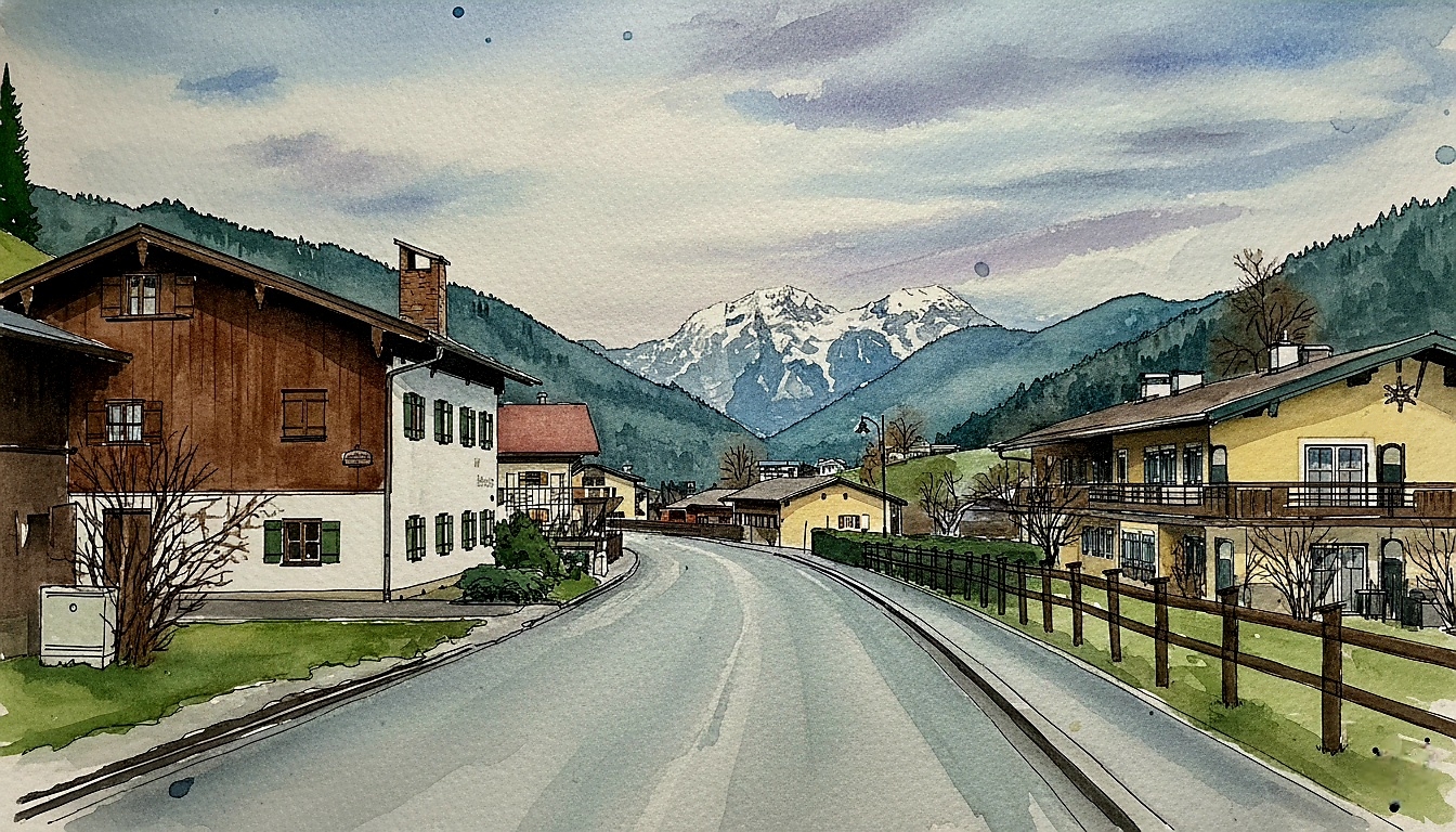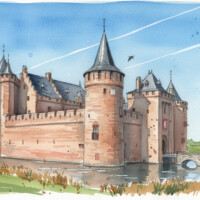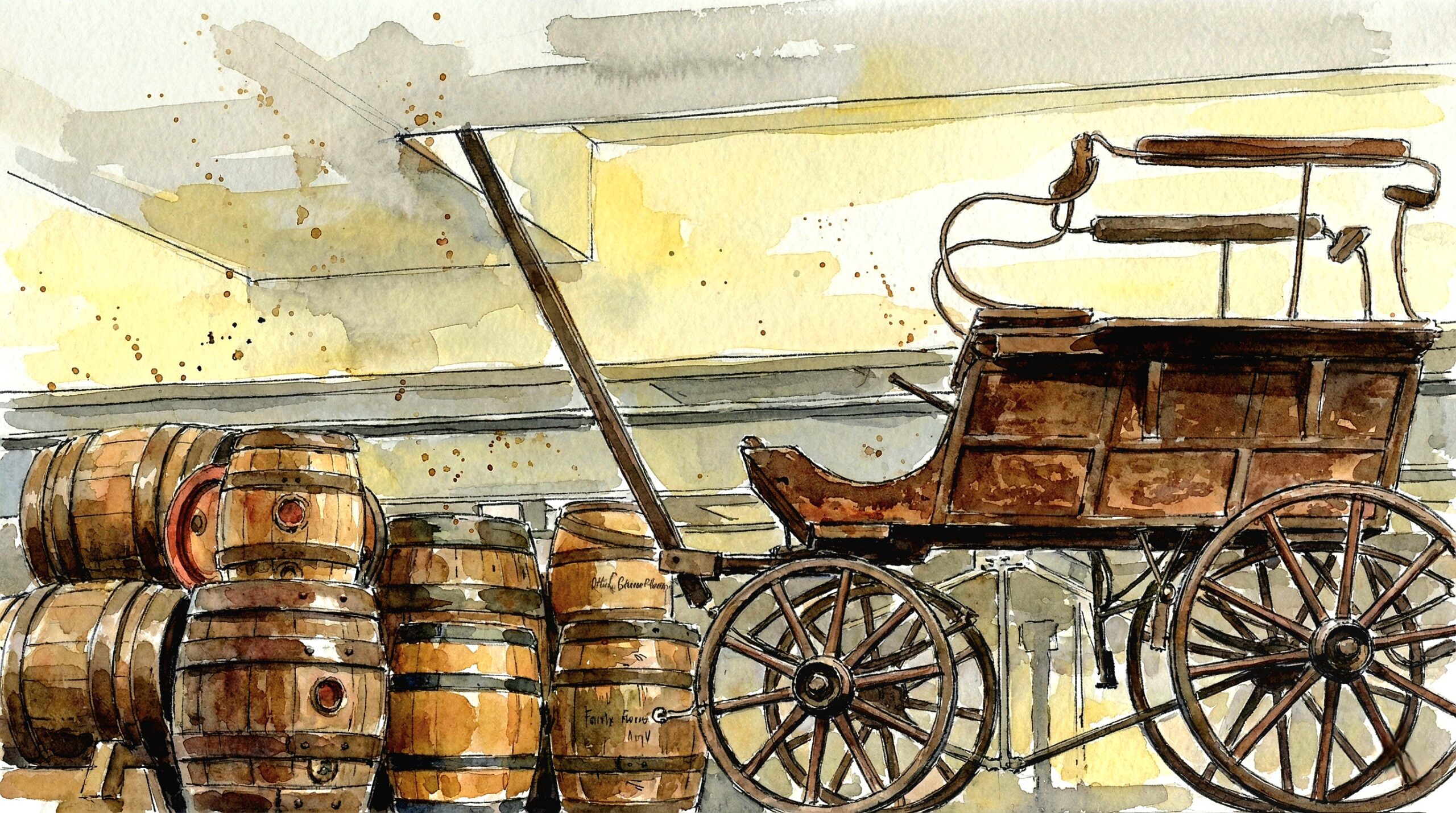 The countryside glows in golden evening light, with green fields and a warm orange sky painting the horizon.