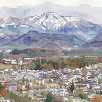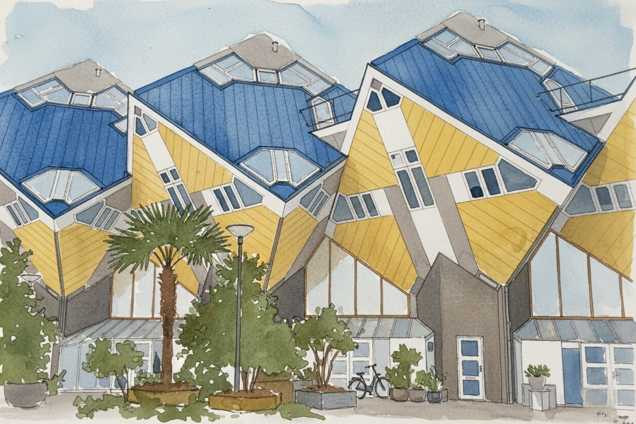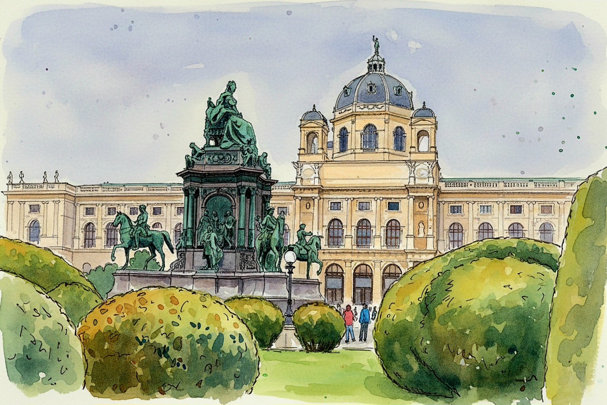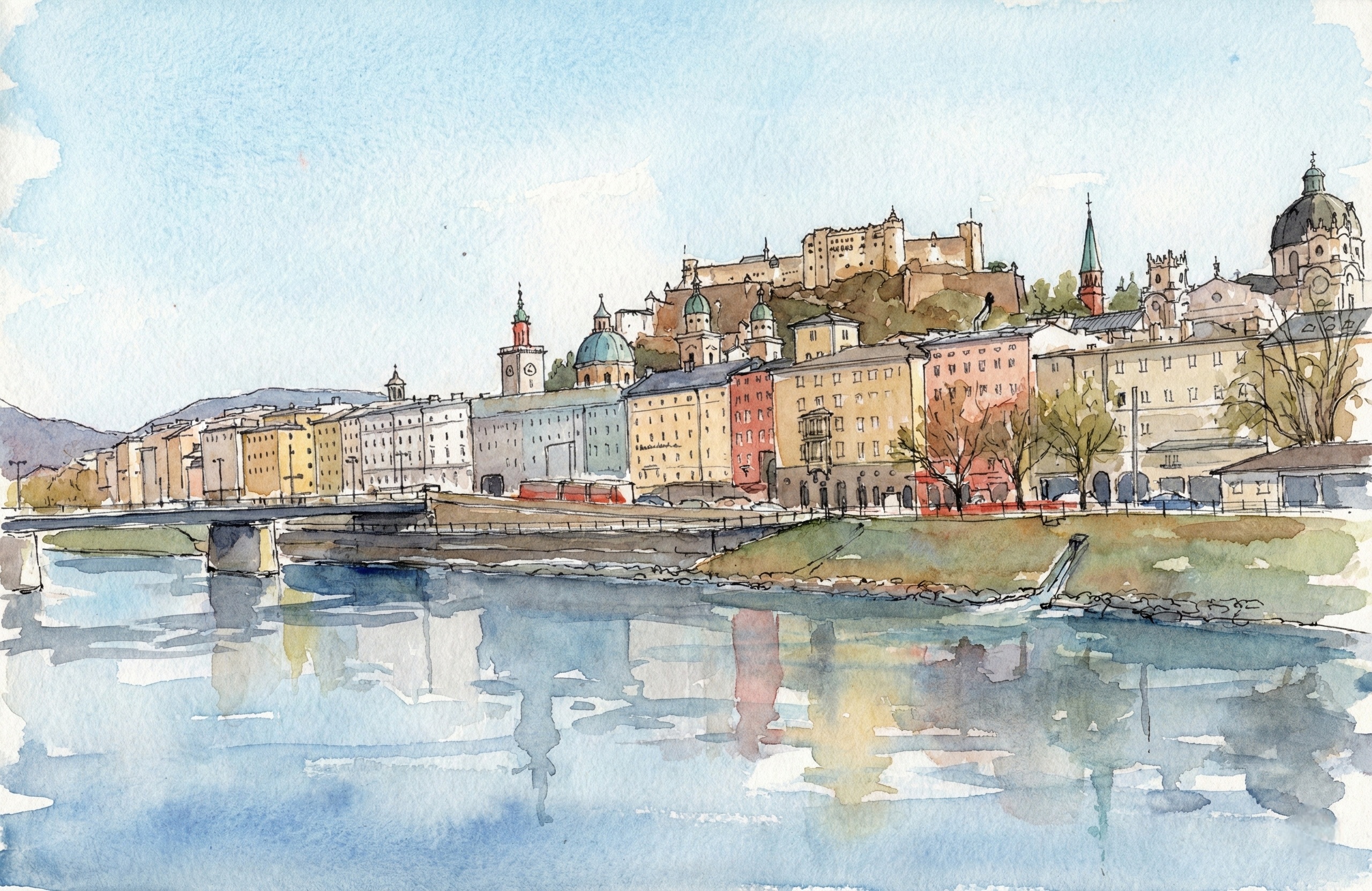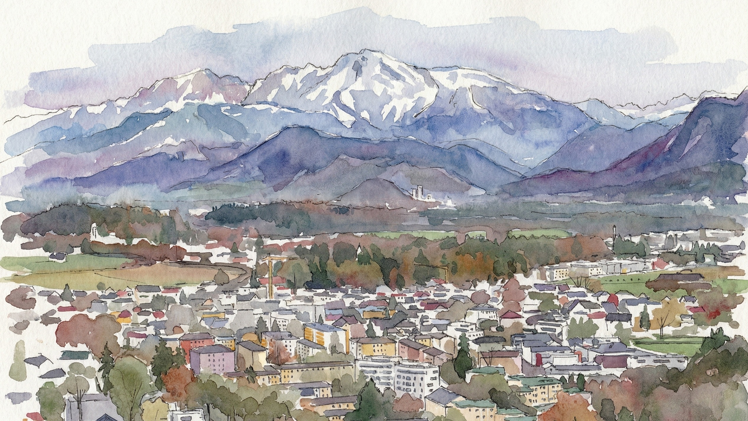 The countryside glows in golden evening light, with green fields and a warm orange sky painting the horizon.