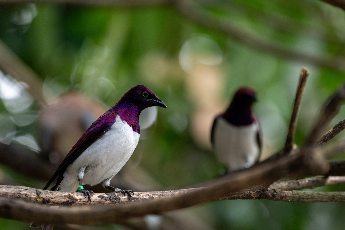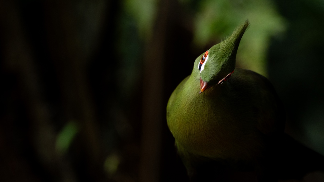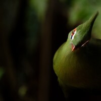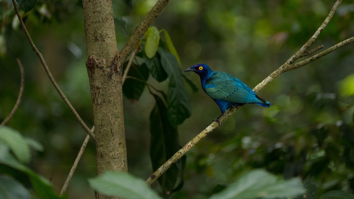 A detailed close-up of a moss-covered tree trunk set against a blurred green forest background.