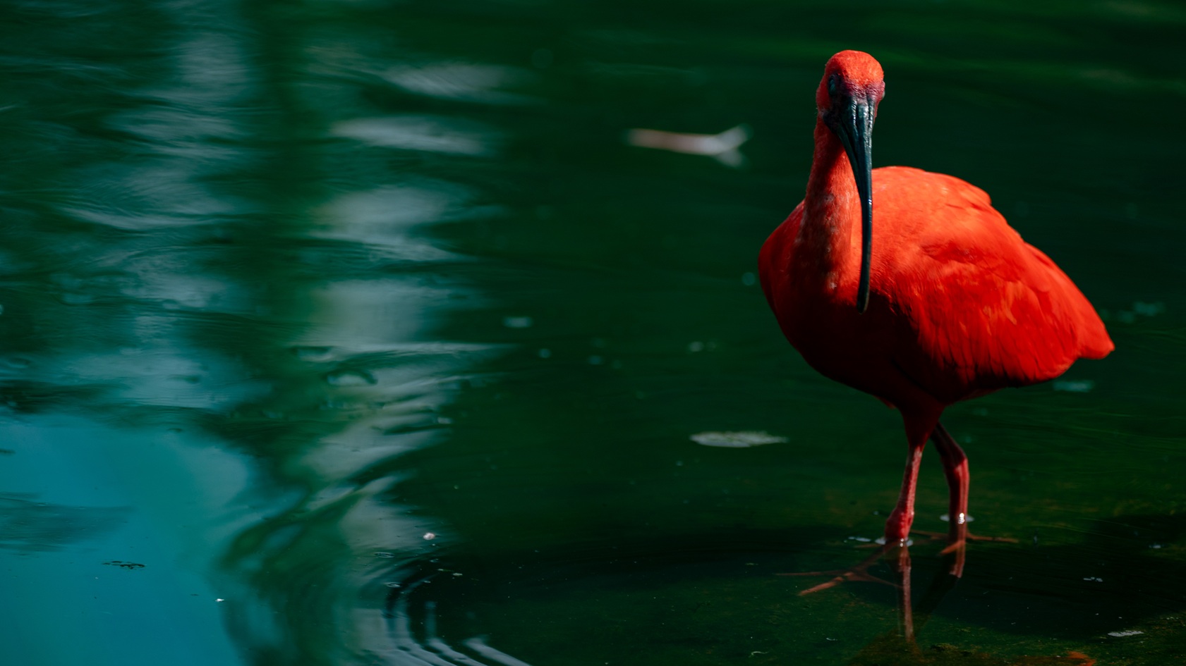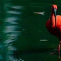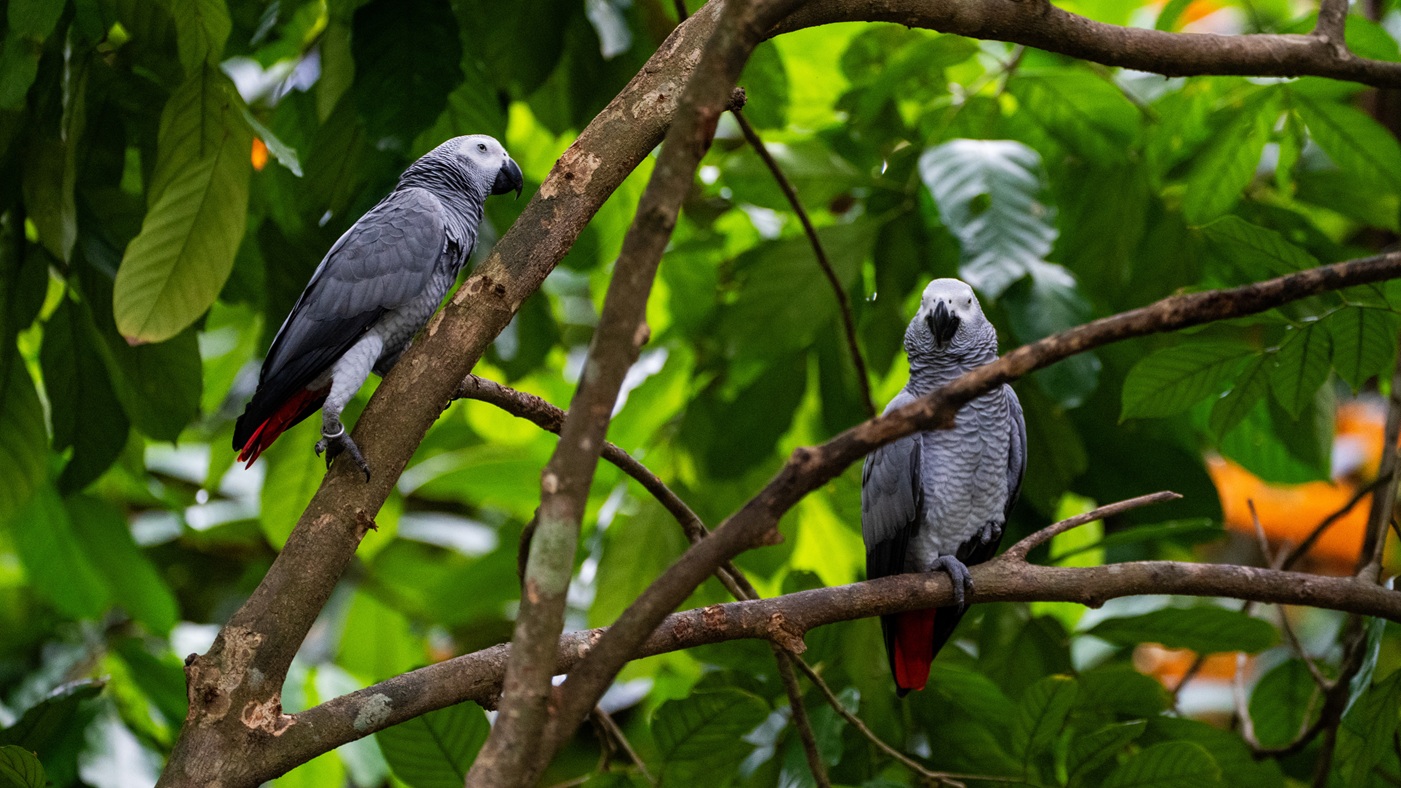 The horizon glows in orange and red as the sun sets, while a crescent moon rises above the silhouetted treetops.