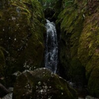 Tall waterfall with bridge above
